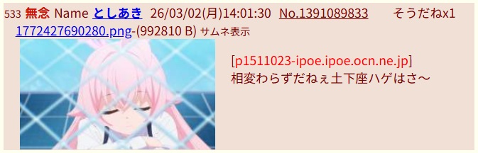 | … | 134無念Nameとしあき26/03/02(月)15:05:31No.1391098905+ 1772431531091.jpg-(52148 B) ブルアニスレで河村派が「土下座ハゲ」とか言ってるよ |