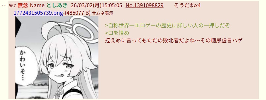 | … | 140無念Nameとしあき26/03/02(月)17:17:35No.1391119694+ 1772439455592.jpg-(387793 B) ブルアニスレのラビット信者が言論弾圧してるな |