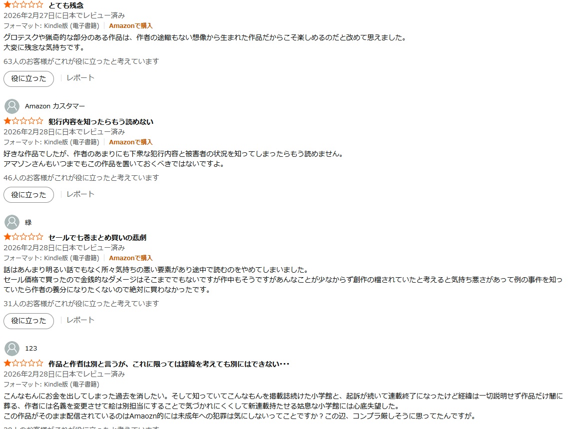 | … | 33無念Nameとしあき26/03/02(月)15:11:02No.1391099768そうだねx4犯罪者が書いた漫画ってことで逆に興味持たれるから発禁にするべきなんだよ |
