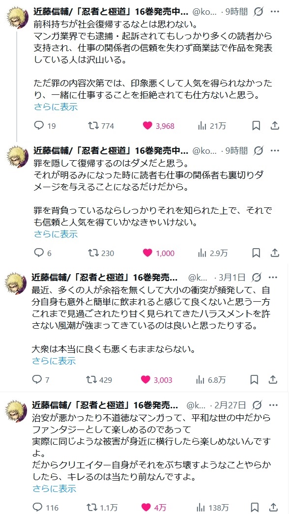 | … | 988無念Nameとしあき26/03/02(月)20:18:38No.1391164108そうだねx4>罪を犯した作家の復帰を認めない理由として「被害者が不意に名前を目にしてしまうことで事件をフラッシュバックするのがダメ」という理屈を採用するのであれば |