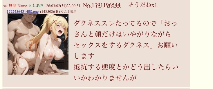 | … | 112無念Nameとしあき26/03/02(月)22:53:27No.1391211024そうだねx1 1772459607957.png-(1033624 B) ダクネスAI絵ちょっと難航してる |