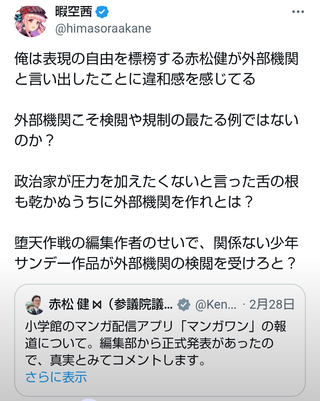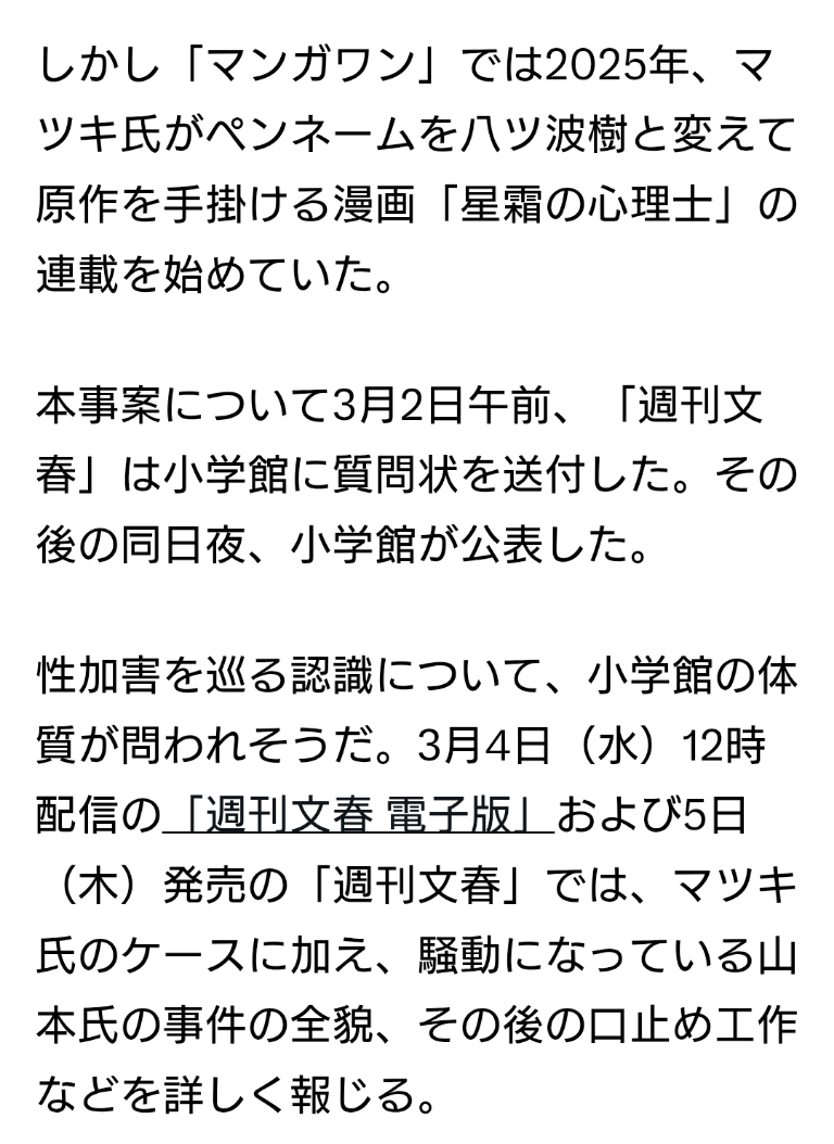| … | 33無念Nameとしあき26/03/02(月)20:42:36No.1391171966そうだねx12短い間に二人も性犯罪者を復帰させてんじゃねぇよ…何考えてんだよ小学館 |