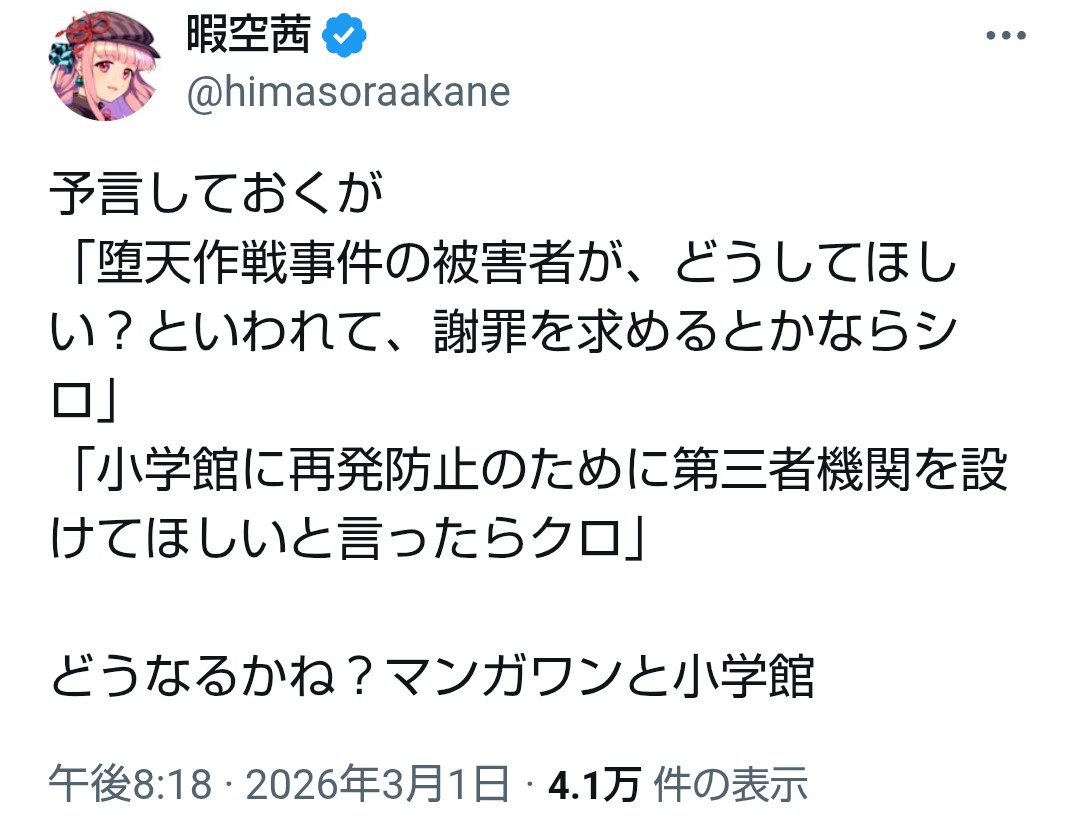 | … | 981無念Nameとしあき26/03/02(月)22:47:08No.1391209430+>ママ小学館止めて来て |