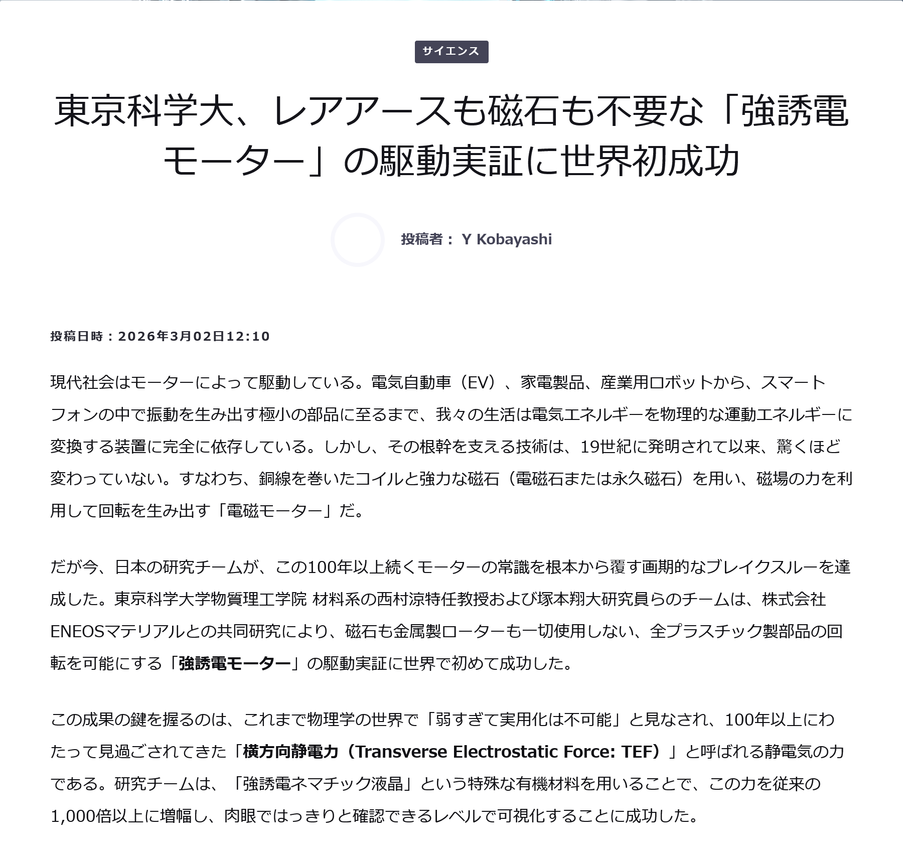 | … | 20無念Nameとしあき26/03/03(火)00:53:35No.1391236680そうだねx1科学大、レアアースフリーで磁場や磁石も利用しない強誘電モータを開発 |