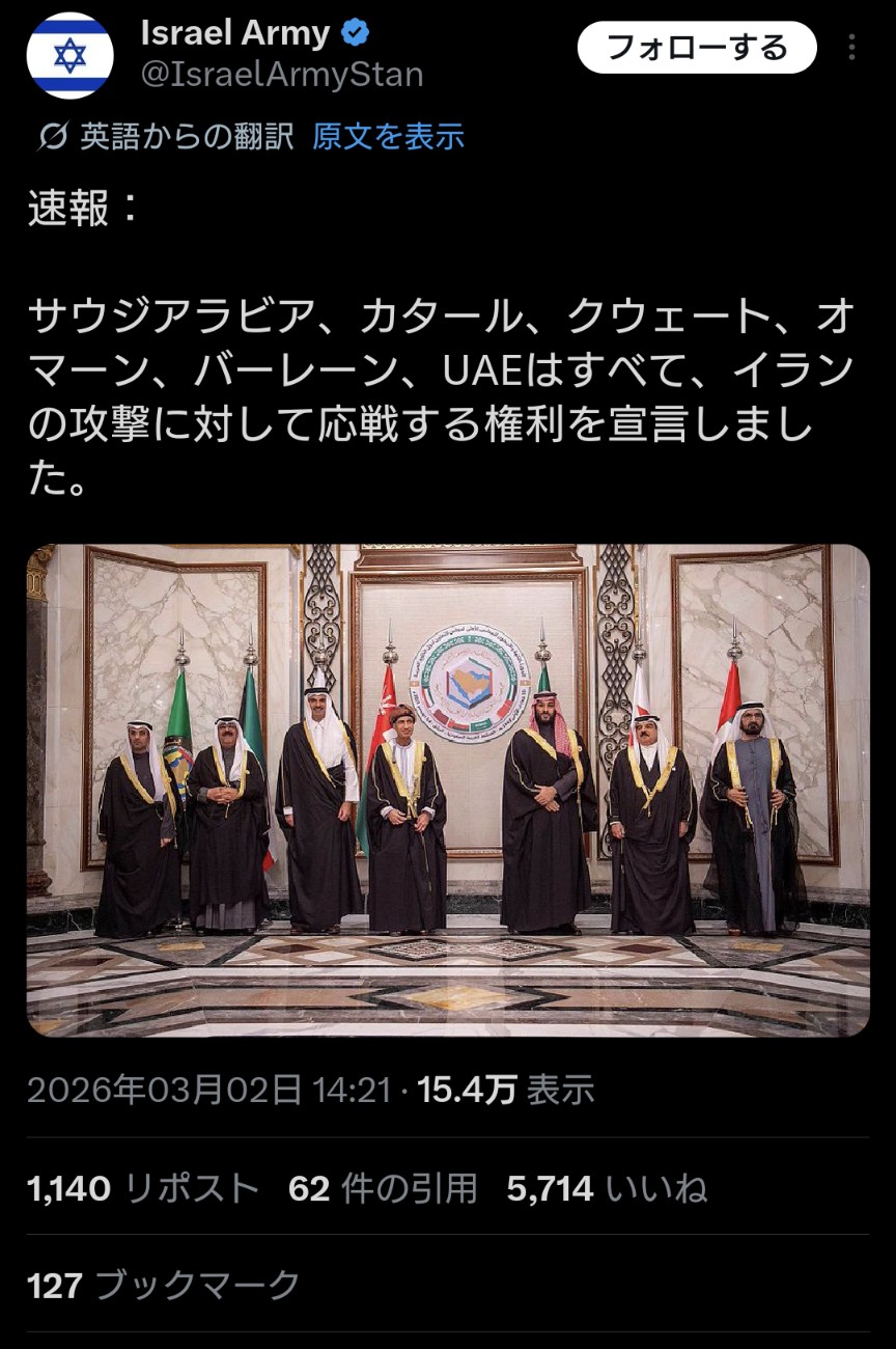 | … | 11無念Nameとしあき26/03/03(火)03:36:01No.1391249789+>イランのおかげで中東まとまっちゃう? |