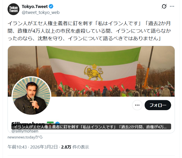 | … | 24無念Nameとしあき26/03/03(火)06:50:17No.1391257842そうだねx2>>イラン人「ハメネイ政権による4万人以上の市民虐殺にはダンマリだったクソどもは黙ってろ」 |
