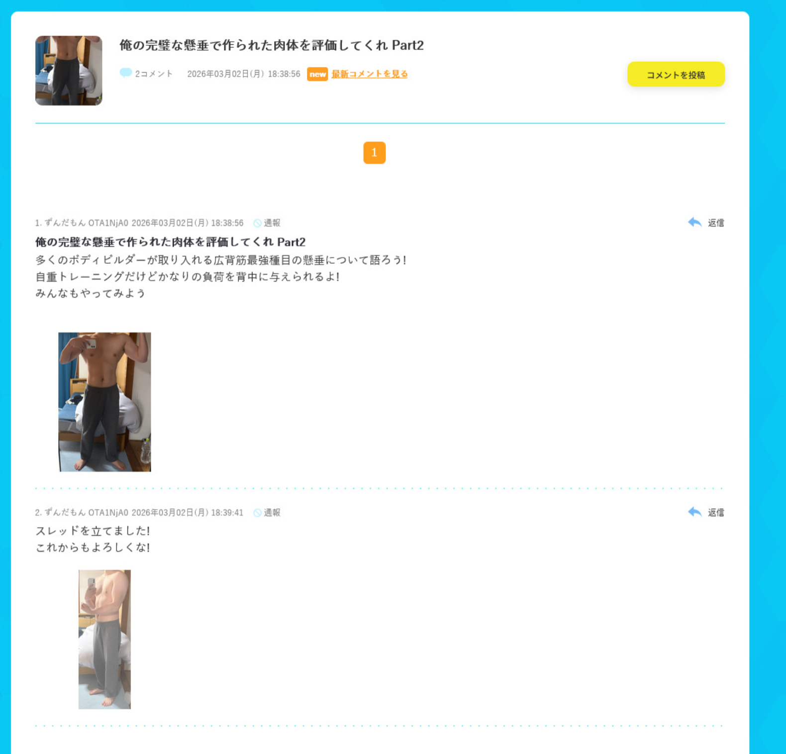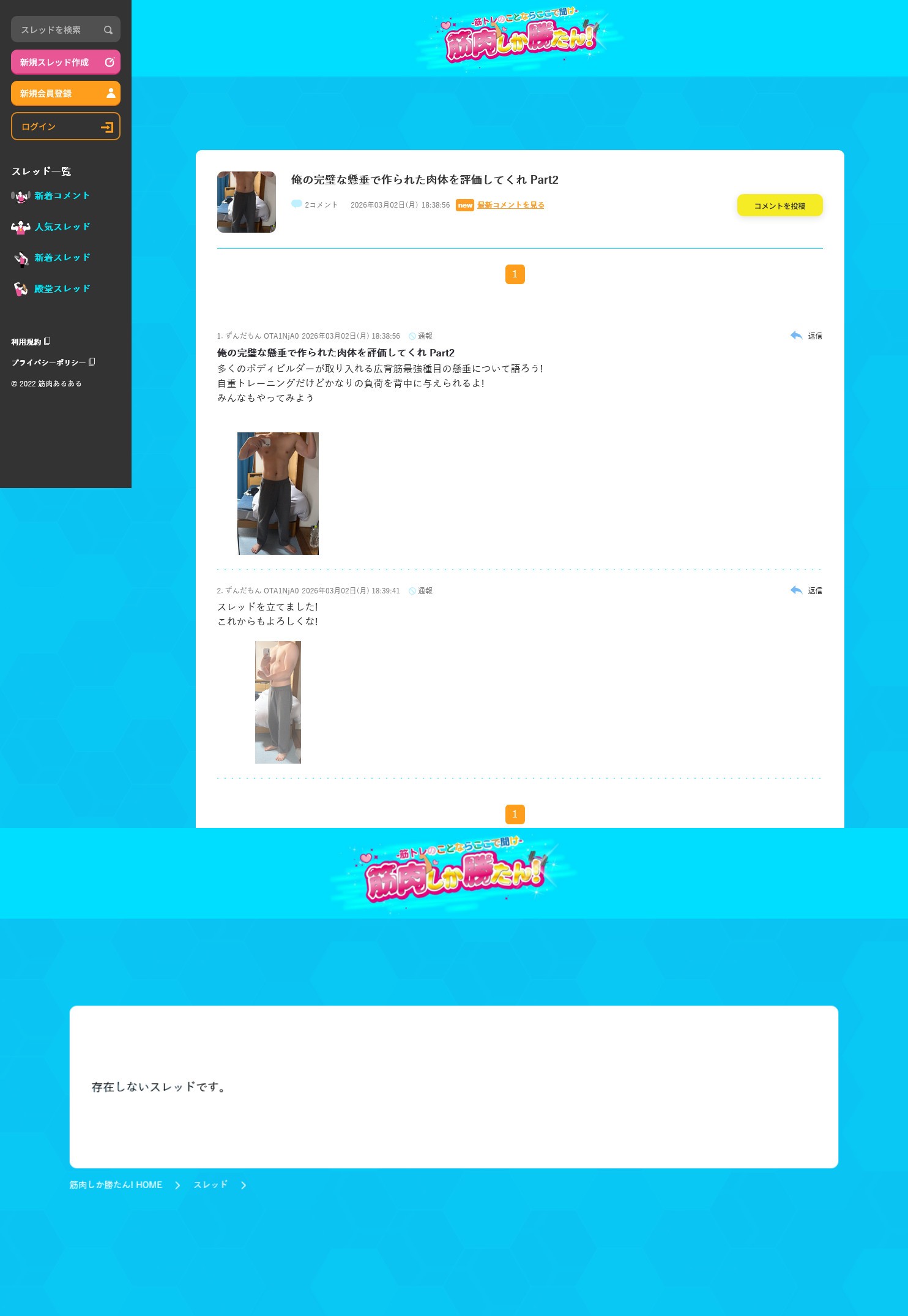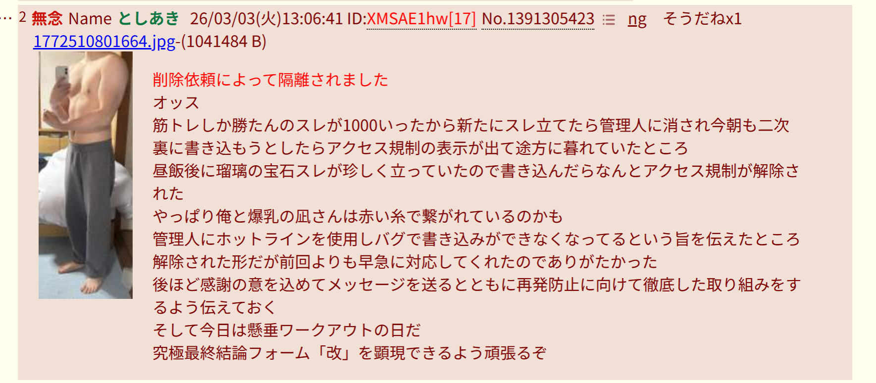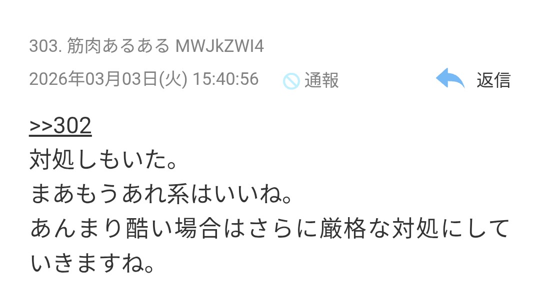 | … | 41無念Nameとしあき26/03/03(火)18:40:15No.1391362385+しょうがねぇなあゲイの掲示板に筋トレスレがないか探してきてやるよ |