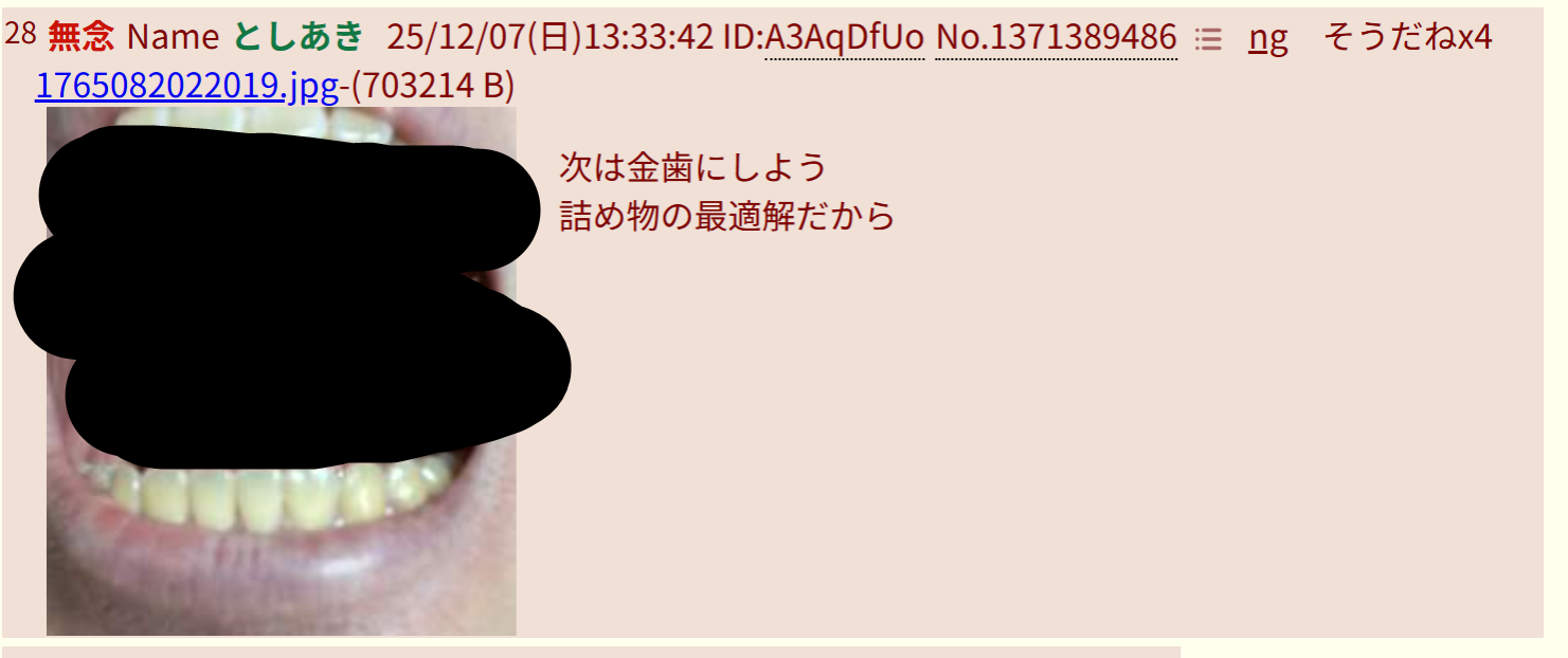 | … | 83無念Nameとしあき26/03/03(火)18:53:40No.1391365475そうだねx2>他は7万円の金歯自慢画像貼るよ |