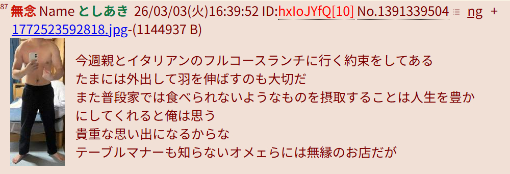 | … | 120無念Nameとしあき26/03/03(火)19:14:05No.1391370623+>貴重な思い出になるほど外食避けてるのにどこでテーブルマナー学んだんだろうね? |