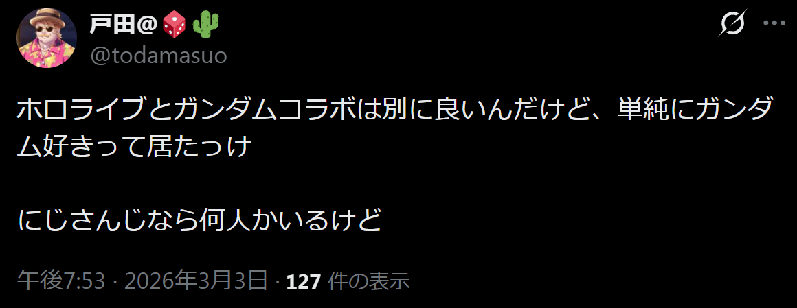 | … | 82無念Nameとしあき26/03/03(火)19:28:20No.1391374309そうだねx13>Xでもガンダムコラボが今までのコラボに比べたら全然平和で助かる |