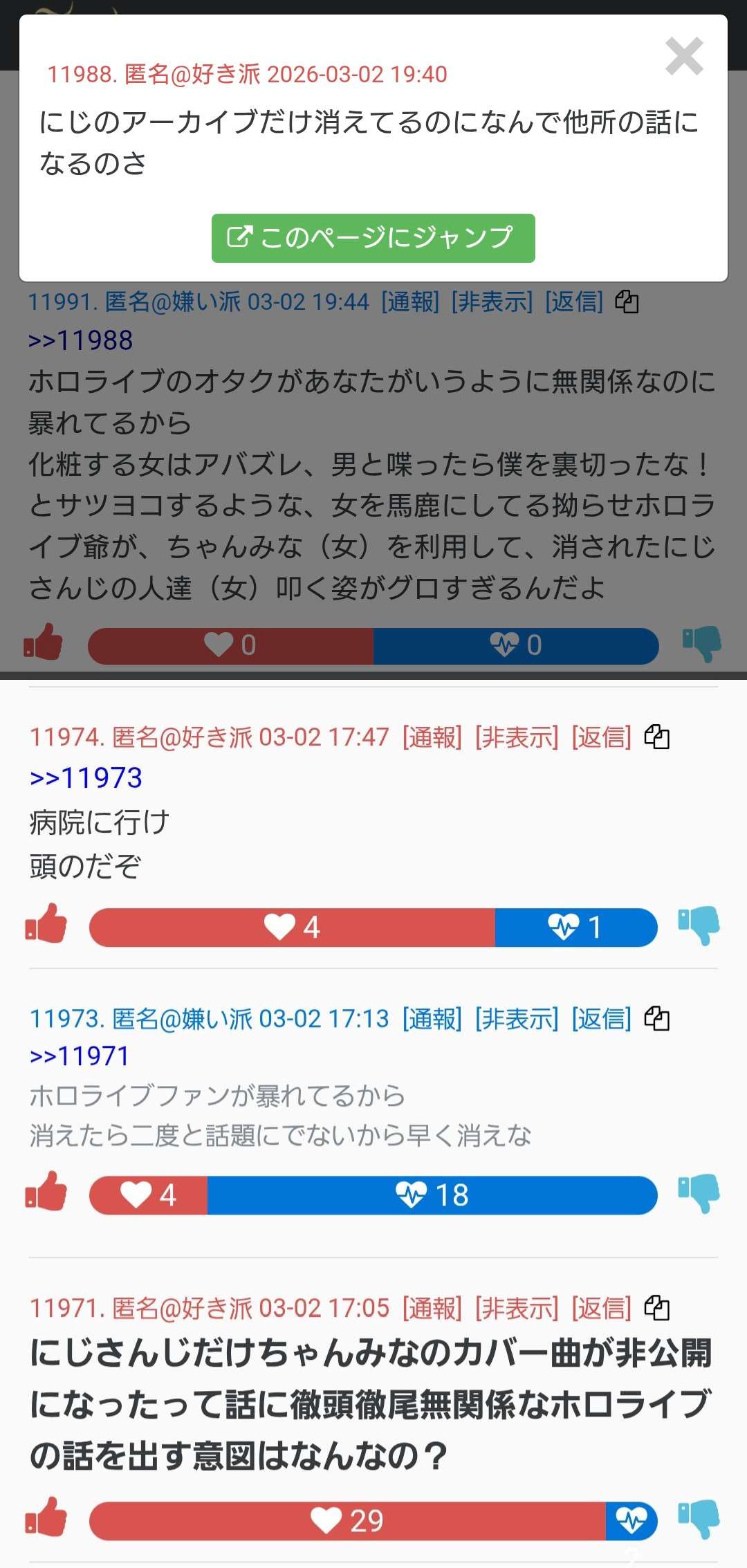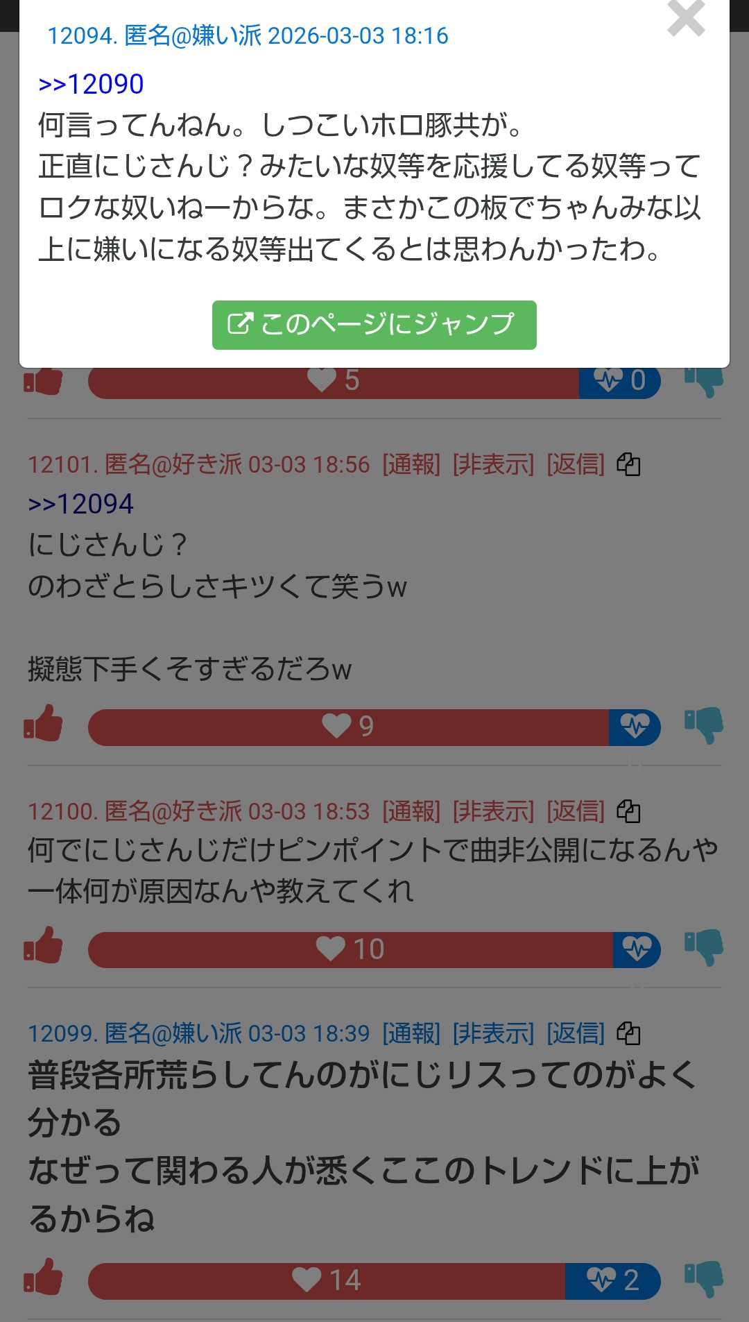 | … | 994無念Nameとしあき26/03/03(火)23:23:40No.1391438628+そんなにアンチ許せないなら好き嫌いのレス全部確認して通報してくれば? |