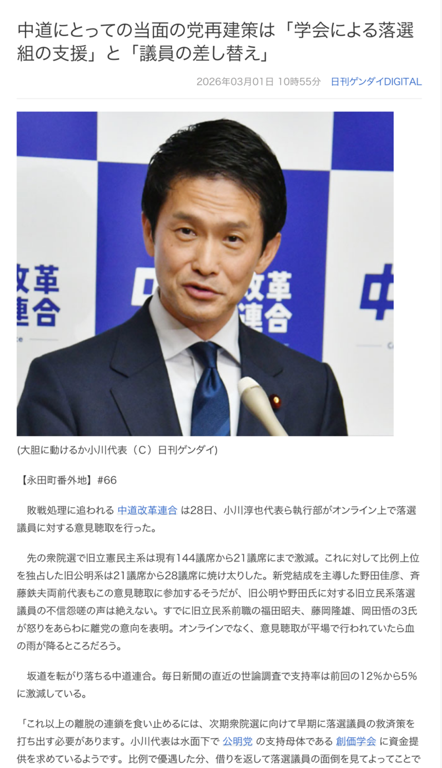 | … | 567無念Nameとしあき26/03/04(水)01:28:31No.1391457927+中道が次の選挙まであるのかとか途中で分裂したら誰の金になるのかとかもちゃんとしてるのかね |