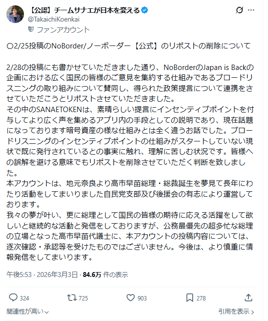 | … | 57無念Nameとしあき26/03/03(火)21:48:11No.1391414235そうだねx1 1772542091690.png-(75145 B) >2/28の投稿にも書かせていただきました通り、NoBorderのJapan is Backの企画における広く国民の皆様のご意見を集約する仕組みであるブロードリスニングの取り組みについて賛同し、得られた政策提言について連携をさせていただこうとリポストさせていただきました。 |