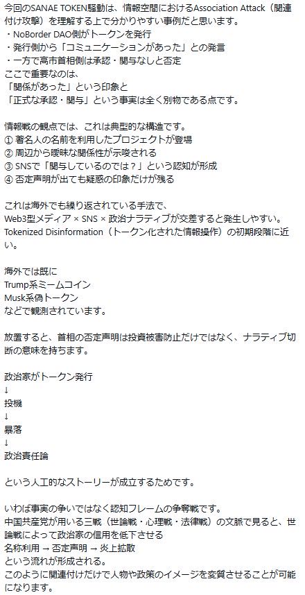 | … | 60無念Nameとしあき26/03/03(火)21:51:30No.1391415118+>でもサナエトークンの会社が高市さんが代表してる事務所の住所と同じなんでしょ? |