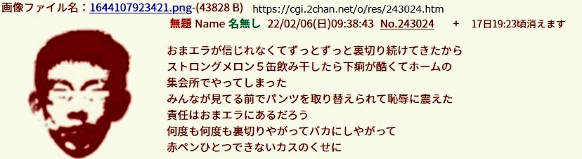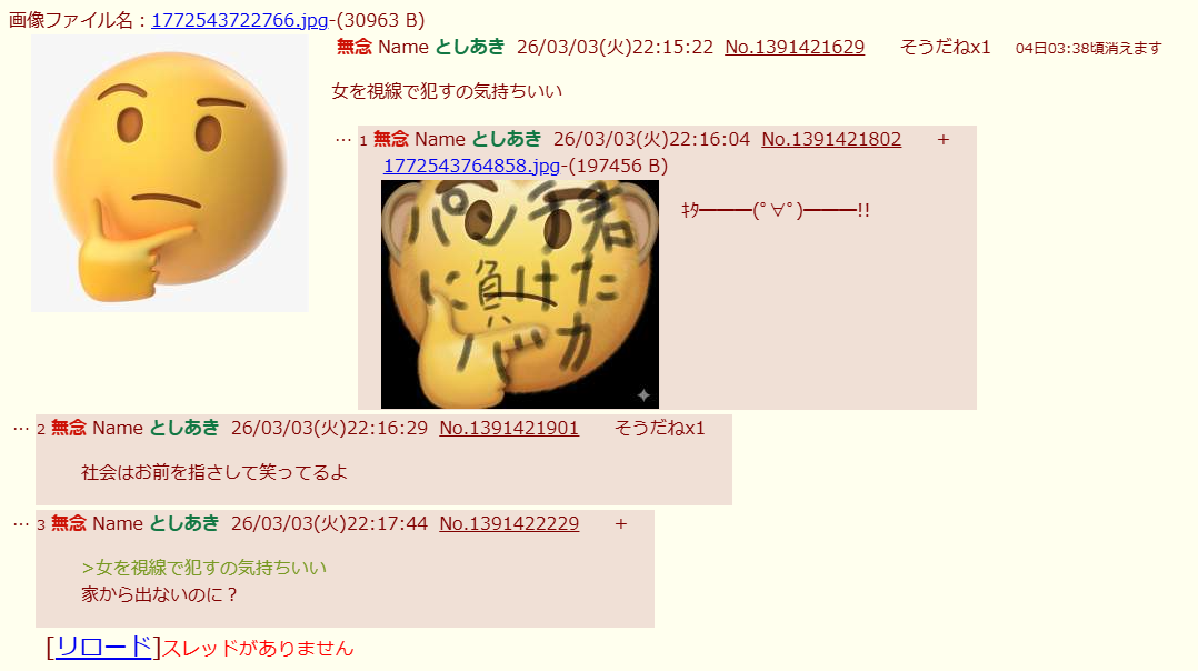 | … | 58無念Nameとしあき26/03/03(火)22:04:35No.1391418688+>>>クスリでもやってんのかキチガイ |