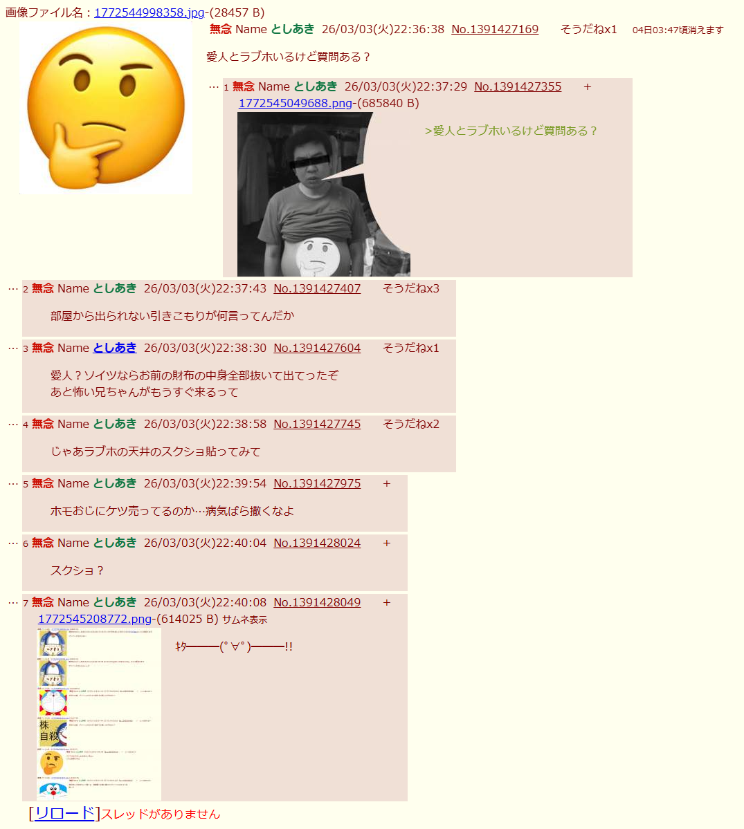 | … | 37無念Nameとしあき26/03/03(火)21:54:12No.1391415871そうだねx7>構ってほしいアホと |