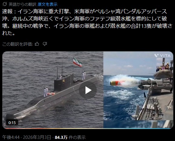 | … | 14無念Nameとしあき26/03/03(火)21:48:46No.1391414372+イラン海軍の軍艦全滅しました |