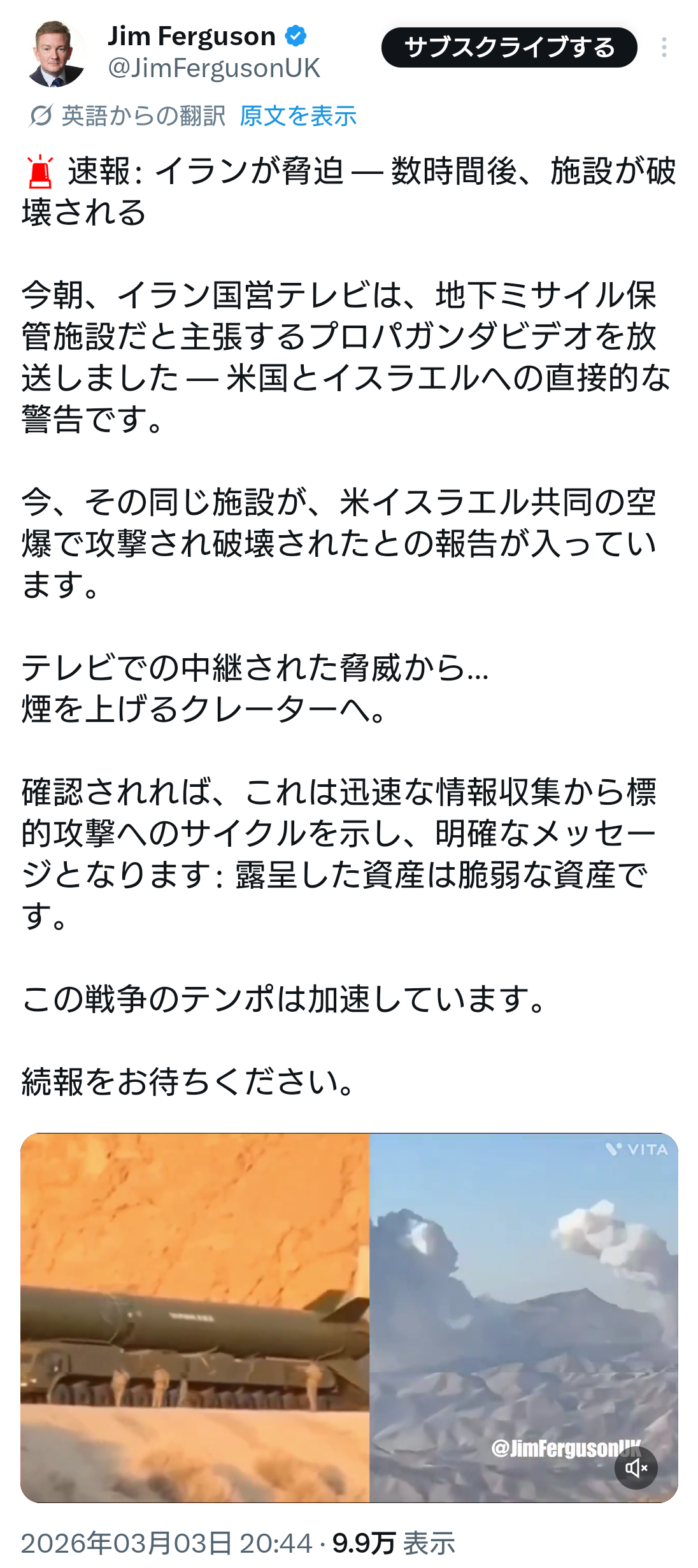 | … | 917無念Nameとしあき26/03/03(火)22:56:44No.1391432283そうだねx1>最新ニュースはYahooニュースよりアルジャーラを見るといいぞ |