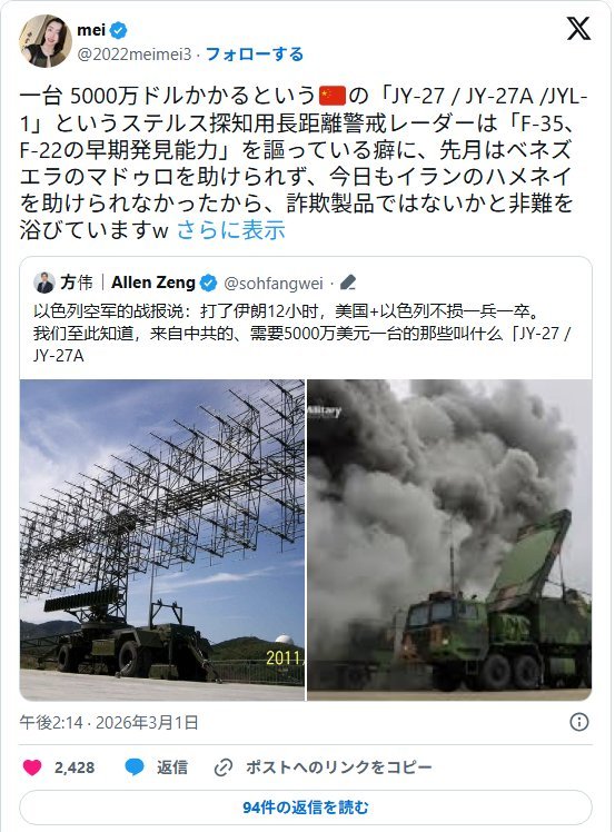 | … | 933無念Nameとしあき26/03/03(火)22:58:17No.1391432632+>>??「ステルス機にも対応してECM対策もついた防空システムを売ってあげるアル」 |