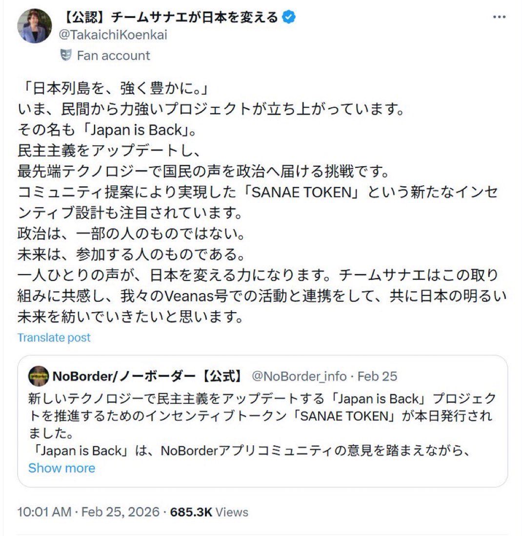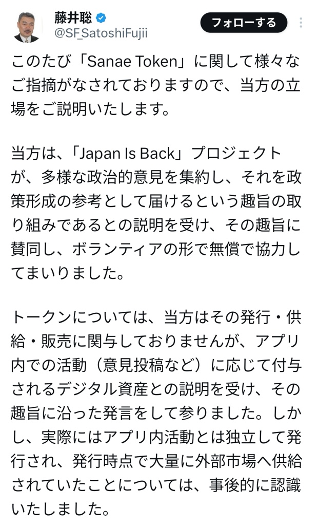 | … | 24無念Nameとしあき26/03/04(水)04:34:07No.1391466483+①発行者側は高市総理の正式な後援会に高市総理をテーマにした「デジタルトークン」を作りたいという話と、肖像権使用の許可はとったが、後援会側は「トークン」は何らかの「クーポン」のようなものだと誤解しており、高市総理本人にも連絡していなかった |