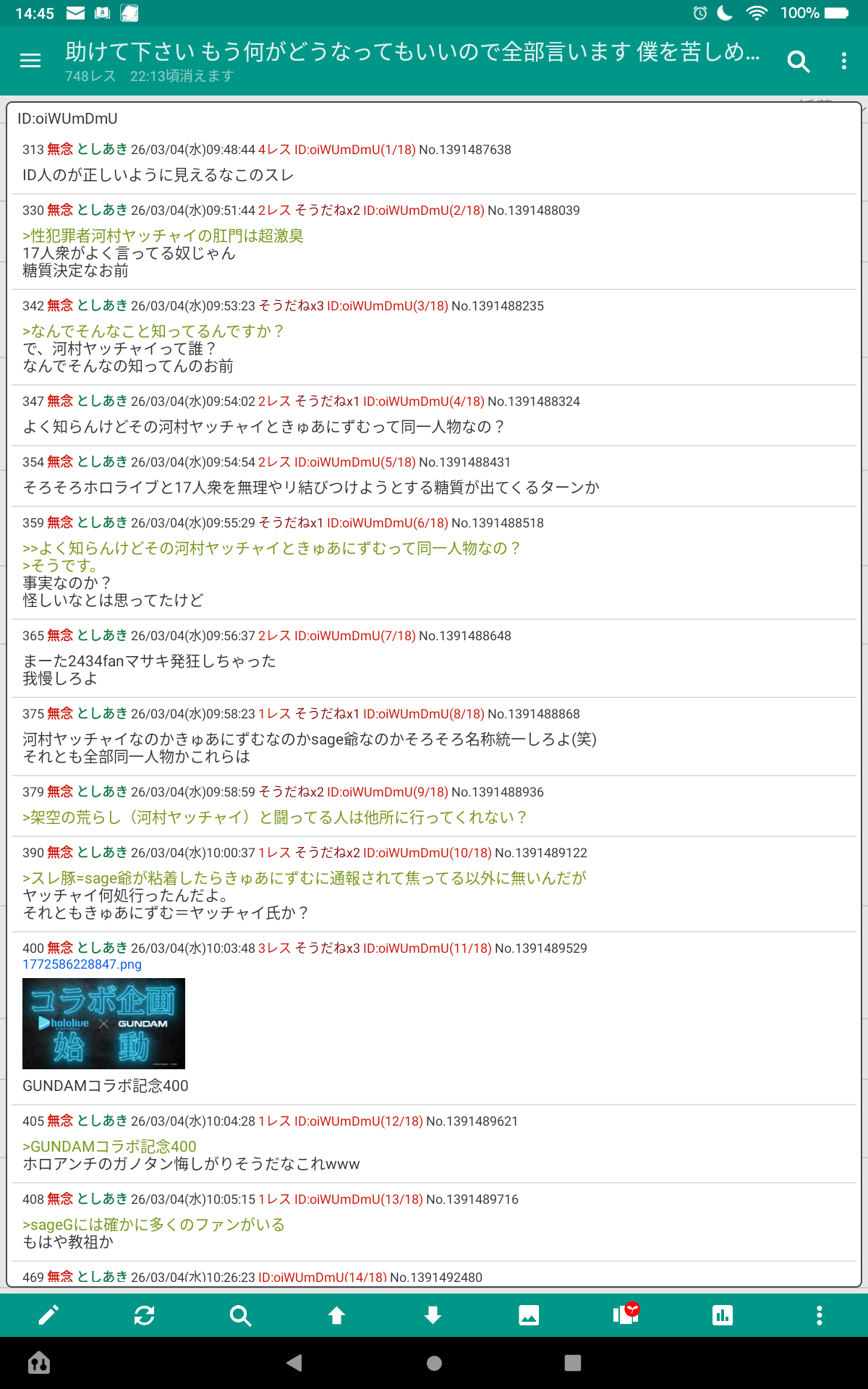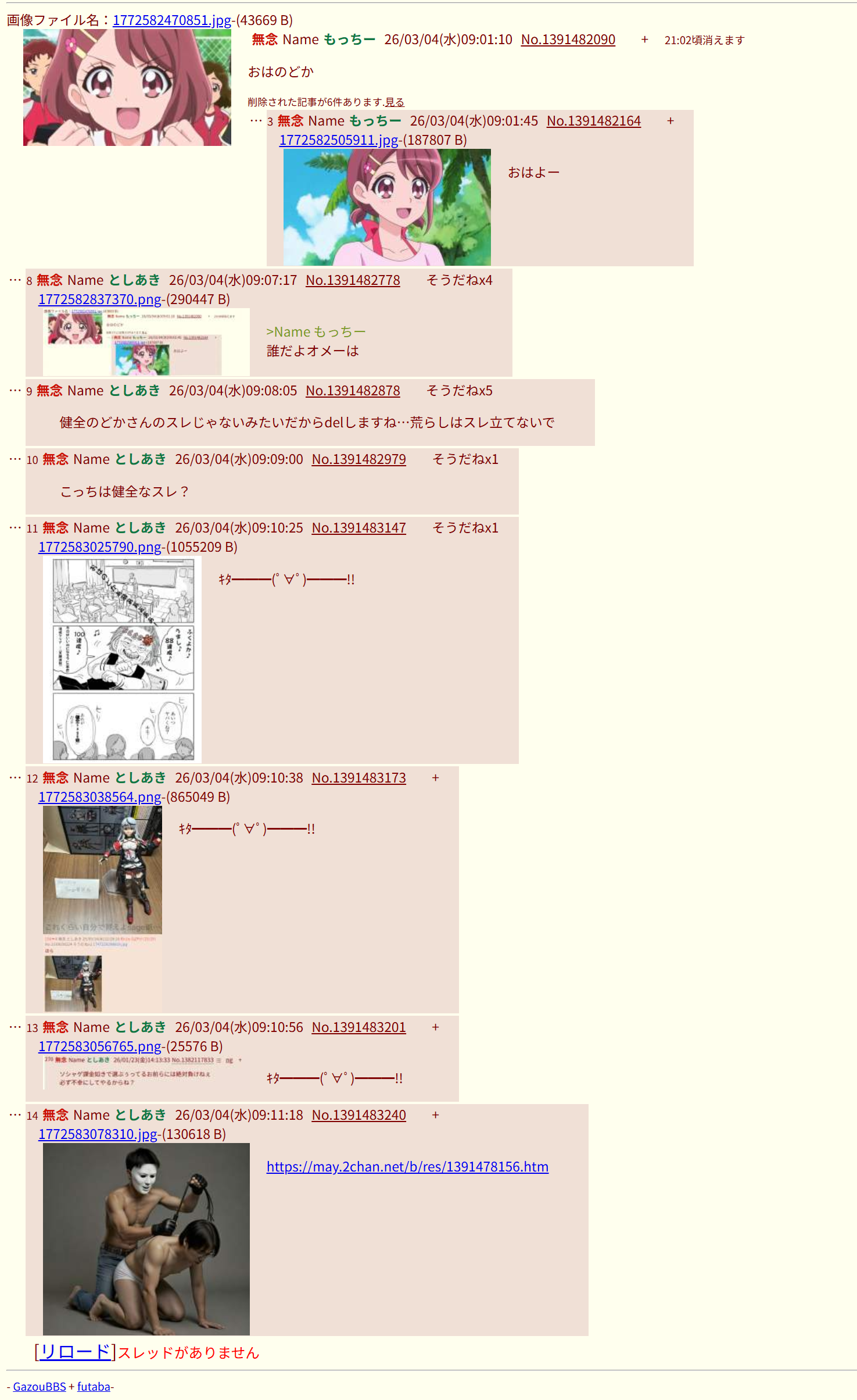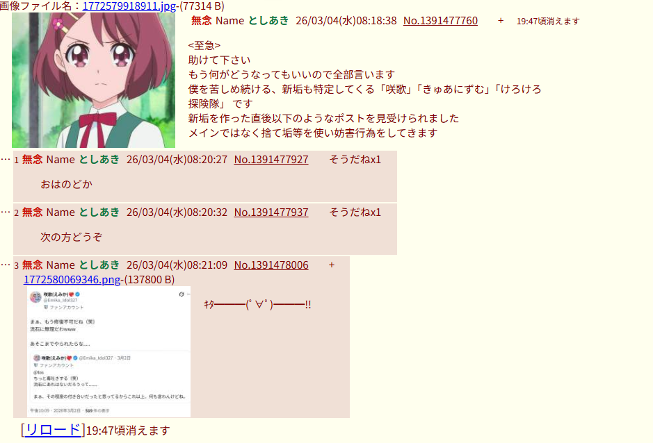 | … | 727無念Nameとしあき26/03/04(水)14:13:09No.1391530020+自治厨たち頼むブル兄スレで暴れてるせんせぇとVガン粘着を倒すのに協力してください |