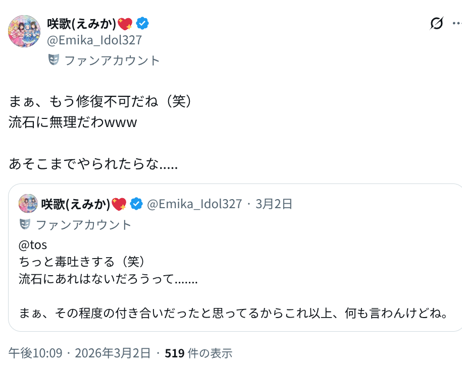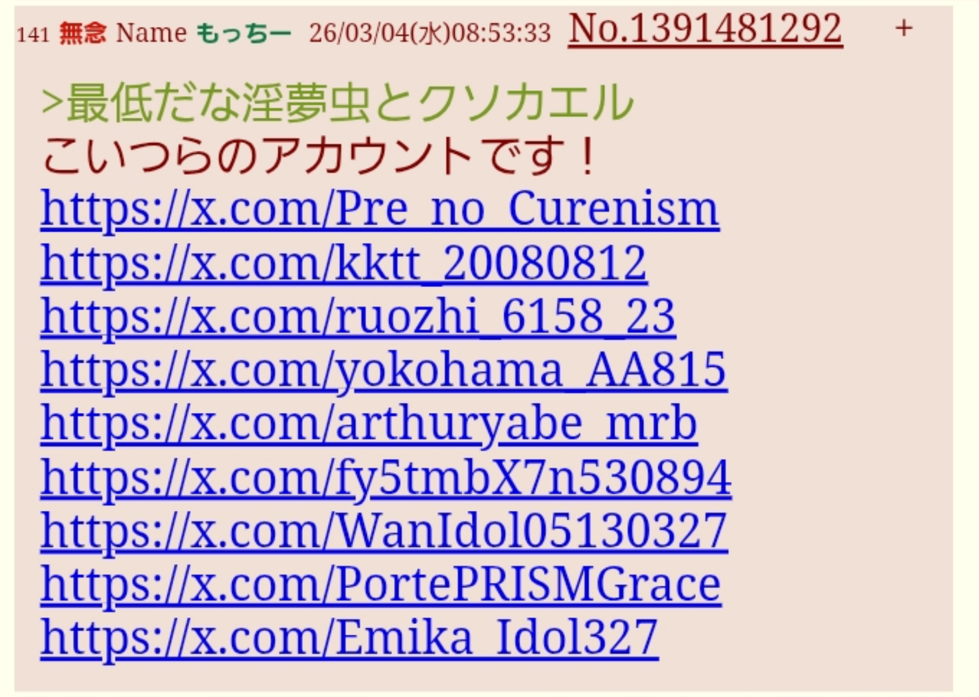 | … | 47無念Nameとしあき26/03/04(水)08:28:32No.1391478734そうだねx15>私は新アカウントを先日作成しましたがこの3人はしつこく私をストーカーしてきました そして悪口や文句を書いて逃げていきました |