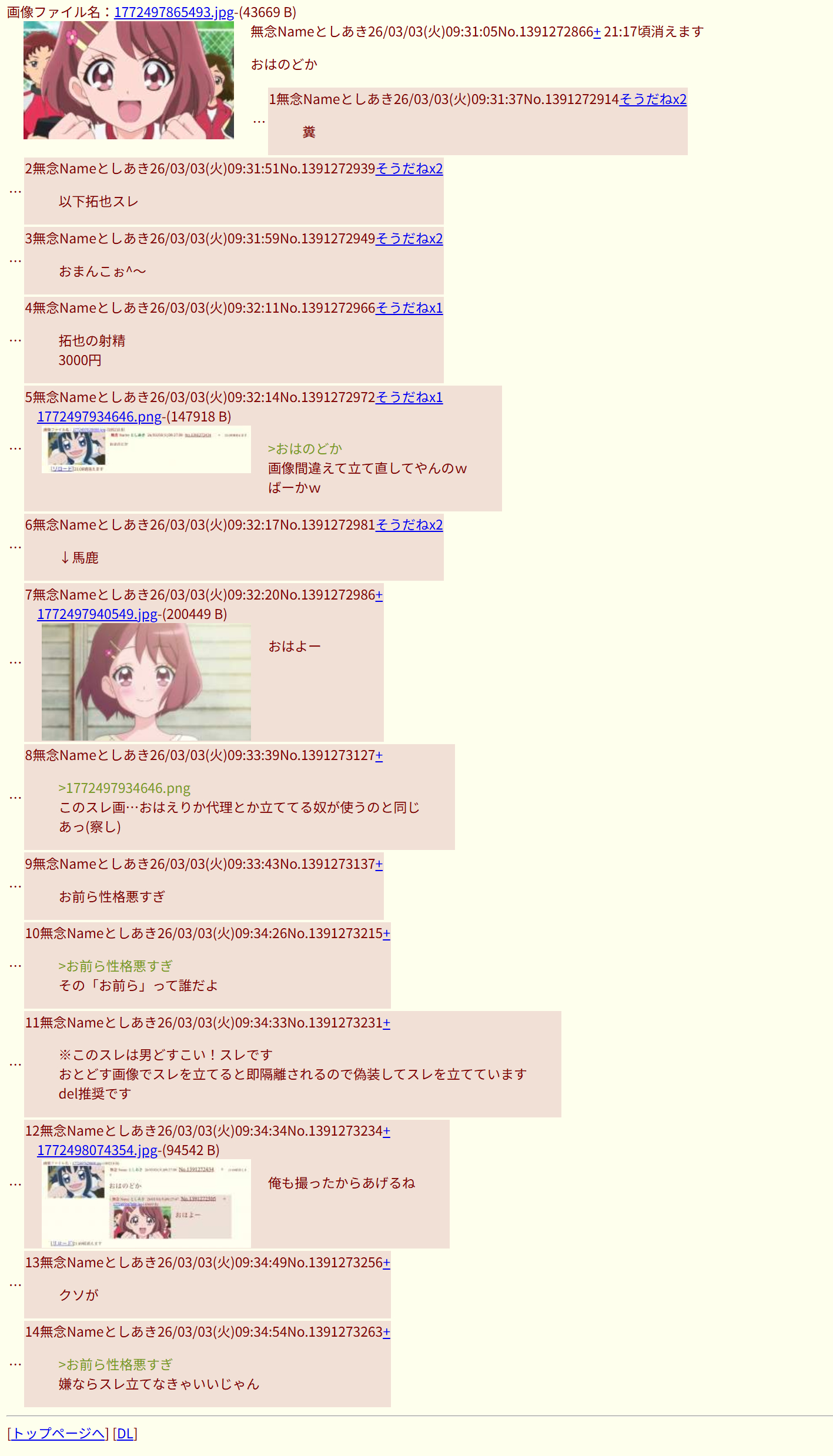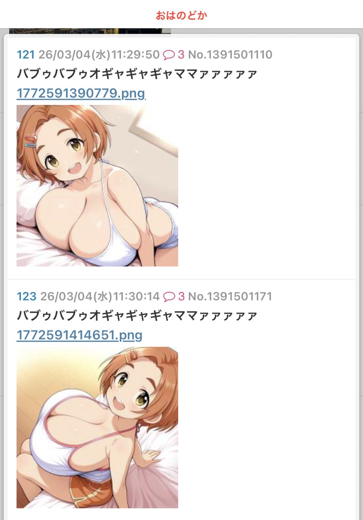 | … | 704無念Nameとしあき26/03/04(水)13:29:05No.1391522822そうだねx8 1772598545941.jpg-(18754 B) >自治厨たち頼むおはのどかスレで暴れてる淫夢虫とクソカエルを倒すのに協力してください |