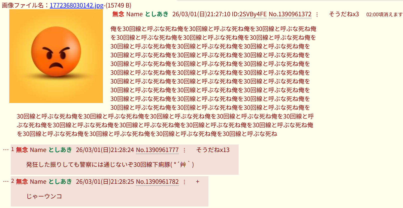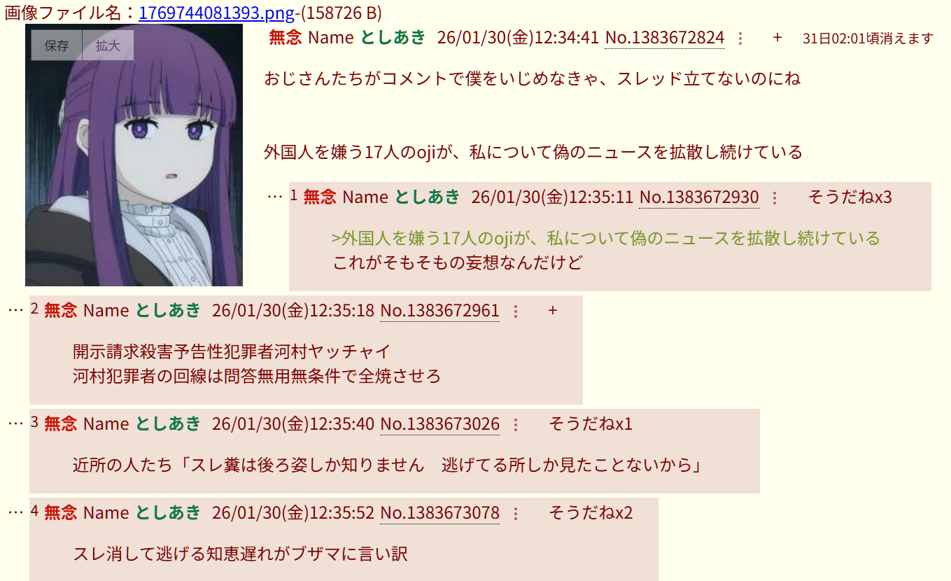 | … | 51無念Nameとしあき26/03/04(水)08:28:55No.1391478776そうだねx4開示請求30回線殺害予告性犯罪者下痢便河村ヤッチャイのクソスレdel |