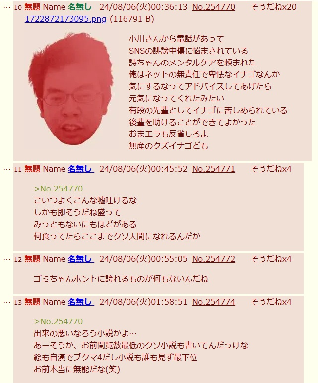 | … | 695無念Nameとしあき26/03/04(水)13:22:54No.1391521708そうだねx5 1772598174067.jpg-(266442 B) >いっぱい文字書けば発言力が上がると信じてる障害者 |