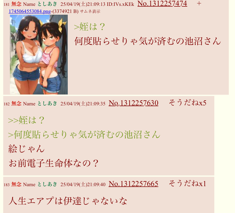 | … | 747無念Nameとしあき26/03/04(水)14:43:15No.1391534365そうだねx4>👴13歳って母乳は出るもんなのか?(義務教育に敗北) |