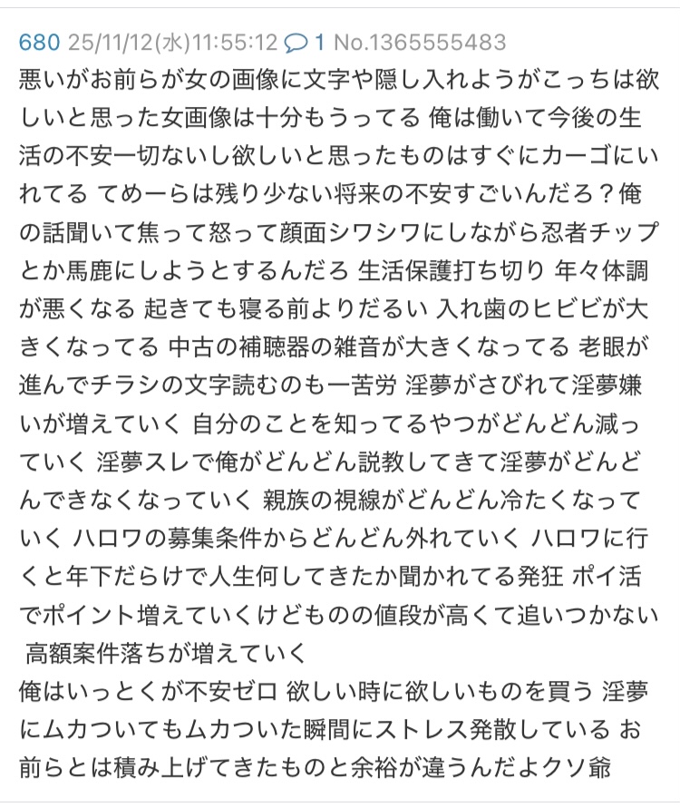 | … | 679無念Nameとしあき26/03/04(水)13:13:33No.1391519991そうだねx7>>爺の文章って本当どくとくな気持ち悪さあるよね |