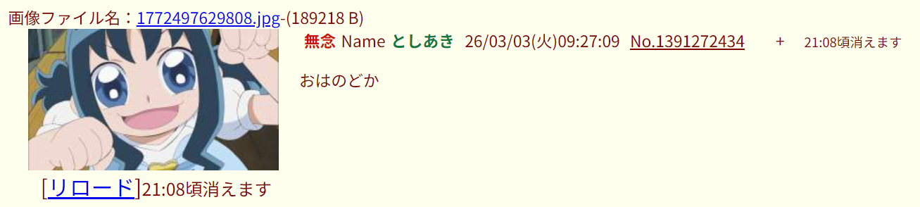 | … | 2無念Nameとしあき26/03/04(水)08:23:26No.1391478220そうだねx13おはのどか^〜 |