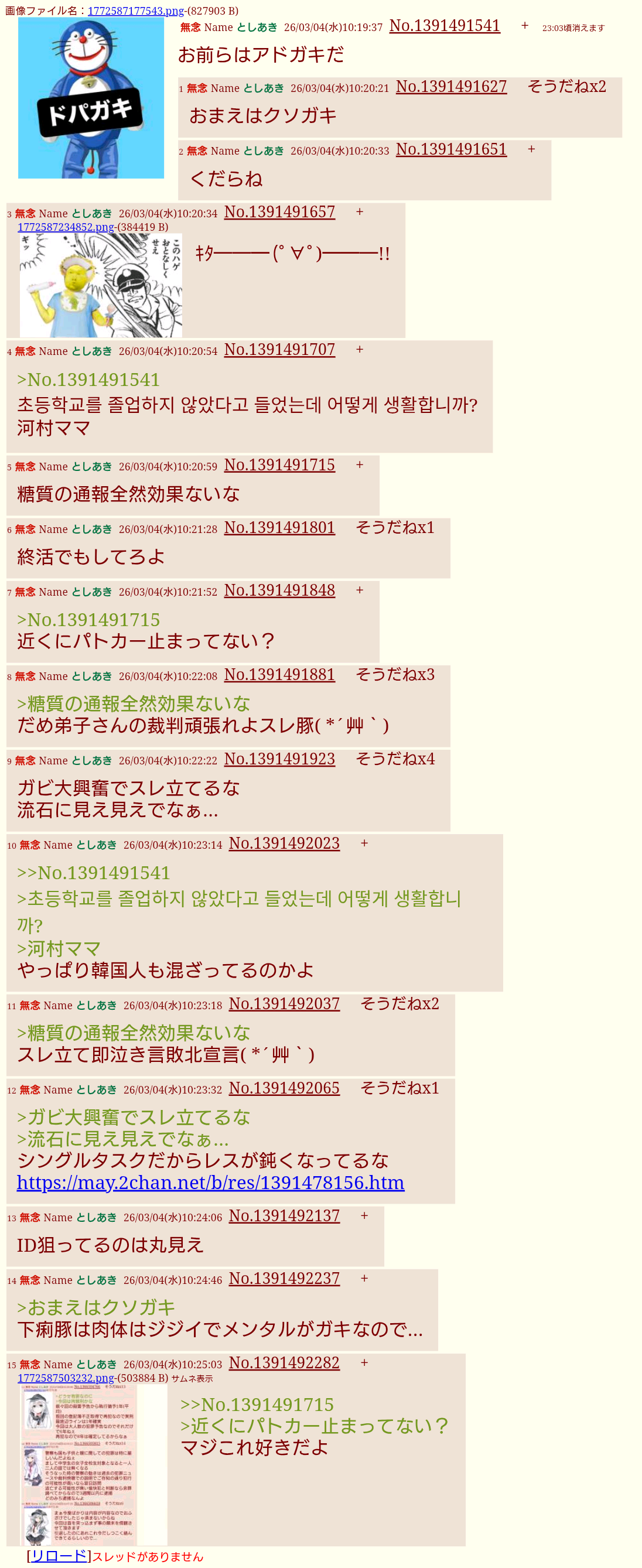 | … | 22無念Nameとしあき26/03/04(水)09:39:14No.1391486534そうだねx1>避難所から追い出された精神異常者スレdel |