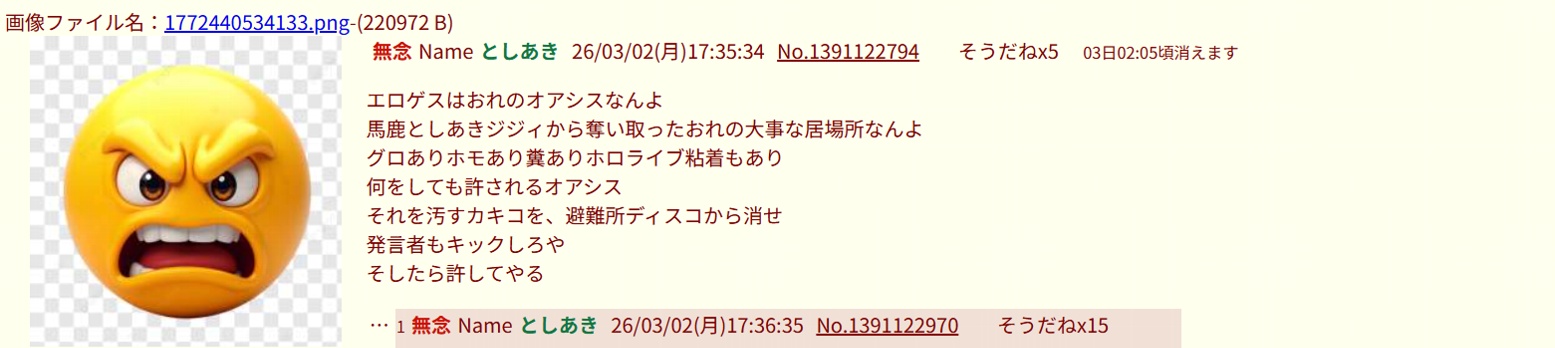 | … | 3無念Nameとしあき26/03/04(水)16:01:14No.1391546567そうだねx4でも下痢豚のお前が荒らしてるじゃん? |