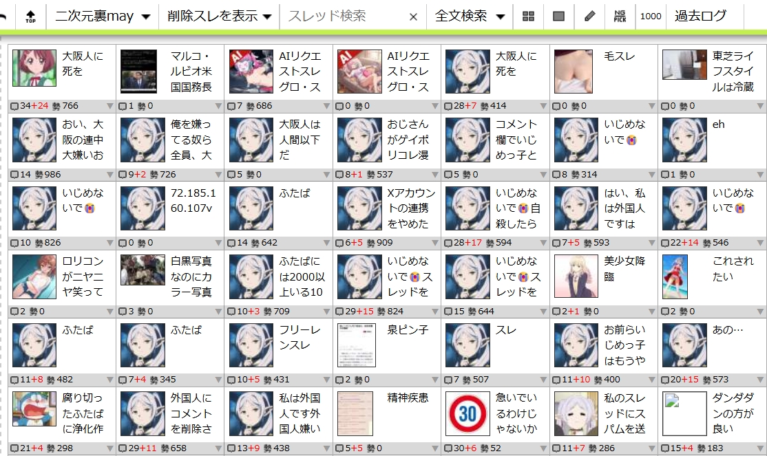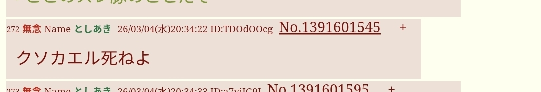 | … | 272無念Nameとしあき26/03/04(水)20:34:22 ID:TDOdOOcgNo.1391601545+クソカエル死ねよ |