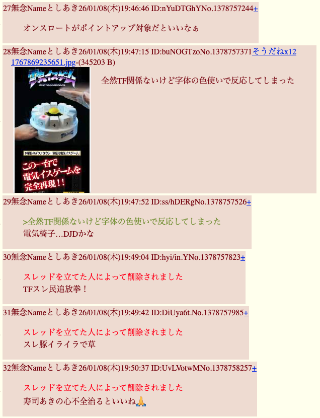 | … | 337無念Nameとしあき26/03/04(水)20:47:46 ID:S/g5qL/gNo.1391605325+>まあ反論がないようだしTFスレへの荒らしは続けますわ |