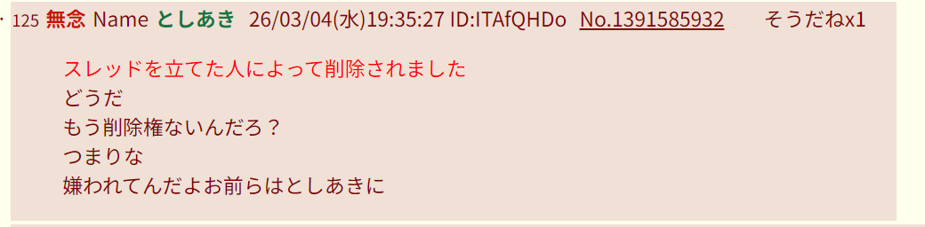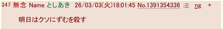 | … | 303無念Nameとしあき26/03/04(水)20:41:30 ID:.ZPM7s6.No.1391603570そうだねx7>臭い文言使ってるしお前の言うことなんか誰も聞かないよ |