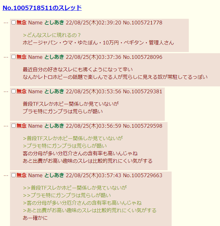| … | 273無念Nameとしあき26/03/04(水)20:34:33 ID:a7yiJG9INo.1391601595そうだねx1このスレの住人がTFスレに多数いるからTFスレが荒らしスレだと判断したんだが |