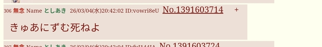 | … | 310無念Nameとしあき26/03/04(水)20:42:52 ID:FtROYYRwNo.1391603950そうだねx3>きゅあにずむ死ねよ |