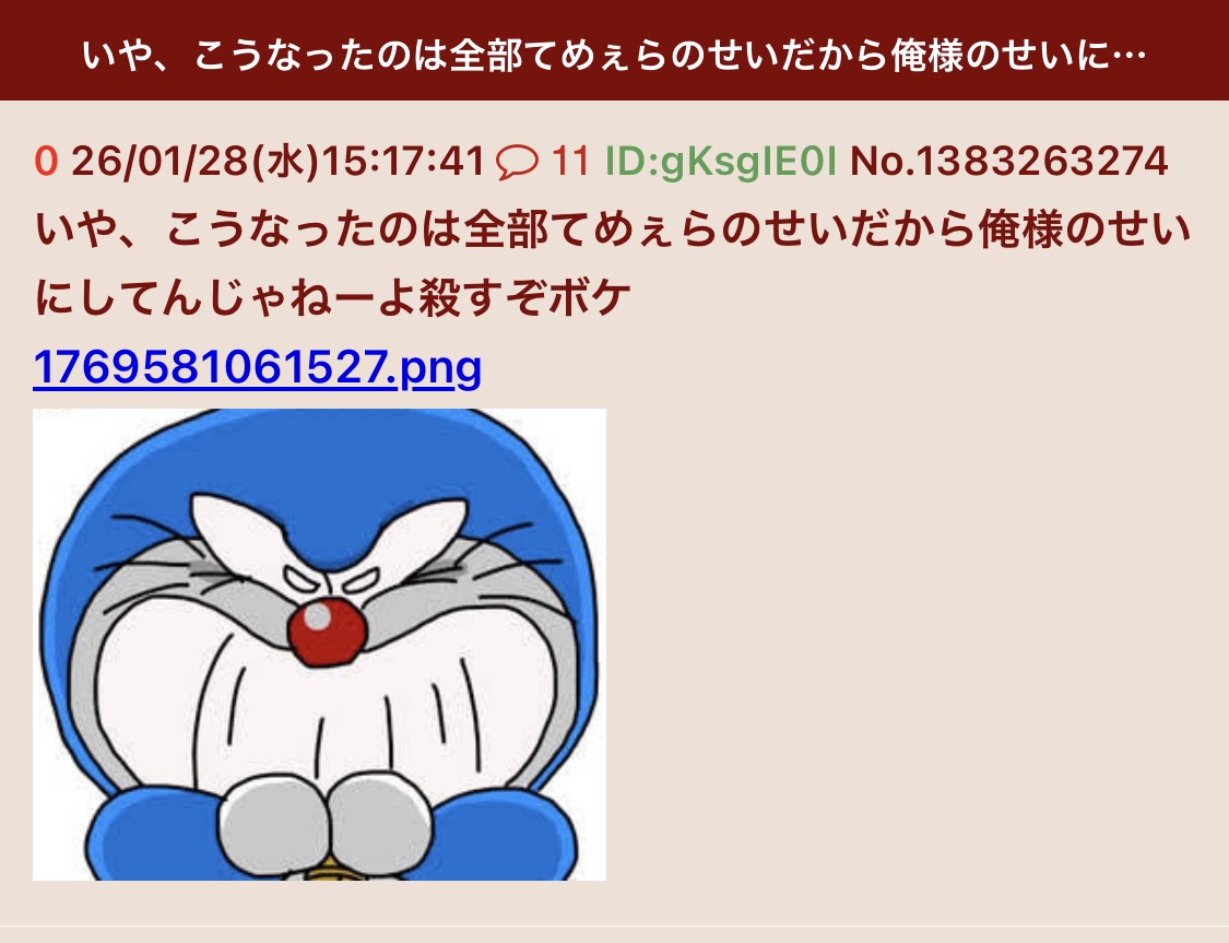 | … | 323無念Nameとしあき26/03/05(木)01:26:55No.1391668632そうだねx1>>というか統失どうのこうのより単純にギリ健もしくは池沼なのかもしれんけど |