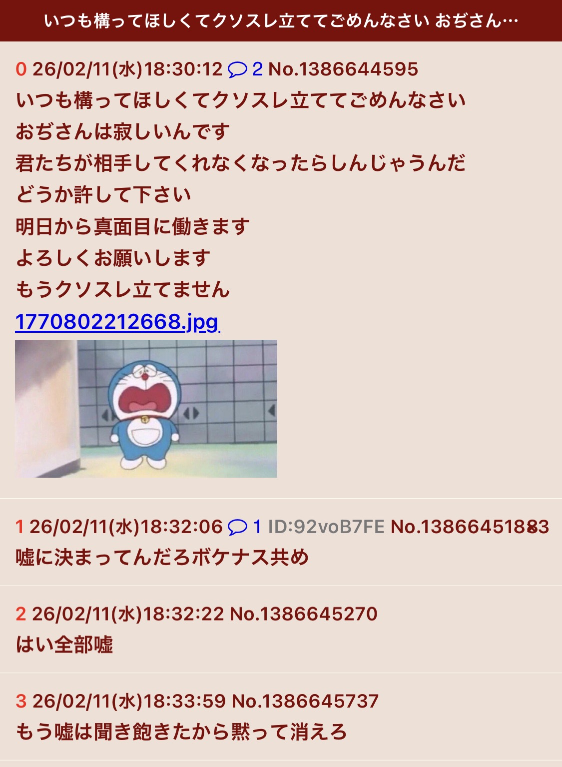 | … | 16無念Nameとしあき26/03/04(水)22:59:58No.1391641737+喧嘩相手が欲しいよぉって泣いてるキチガイ構ってちゃんの相手しちゃうの笑う |