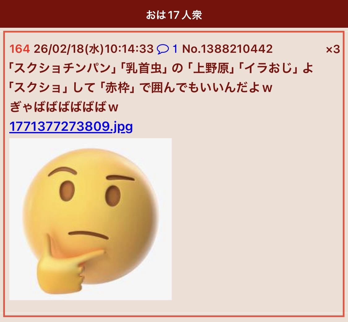 | … | 321無念Nameとしあき26/03/05(木)01:25:12No.1391668429そうだねx2>というか統失どうのこうのより単純にギリ健もしくは池沼なのかもしれんけど |