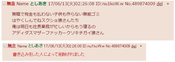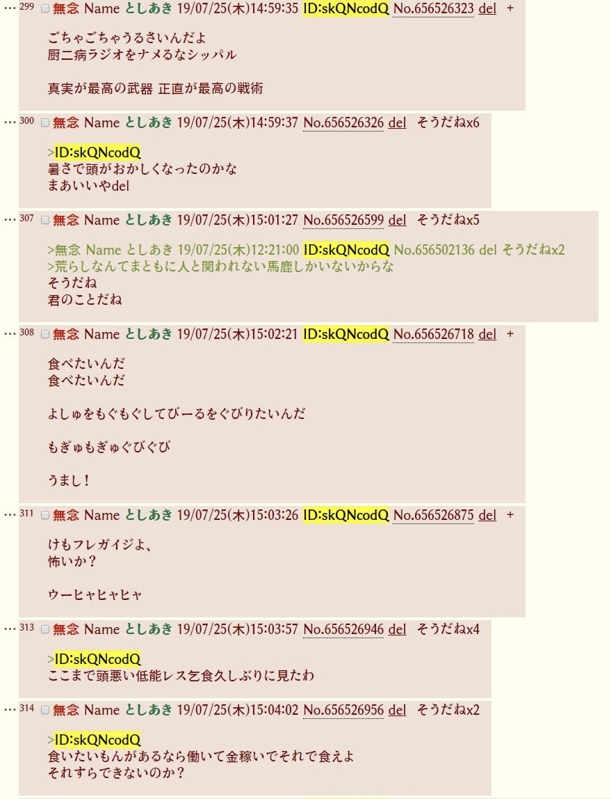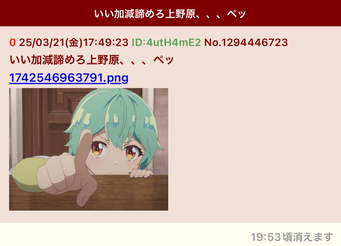 | … | 316無念Nameとしあき26/03/05(木)01:09:20No.1391666362そうだねx3俺も人の事とやかく言える人間ではないが一日中二次裏で荒らしと戦って楽しいのかな? |