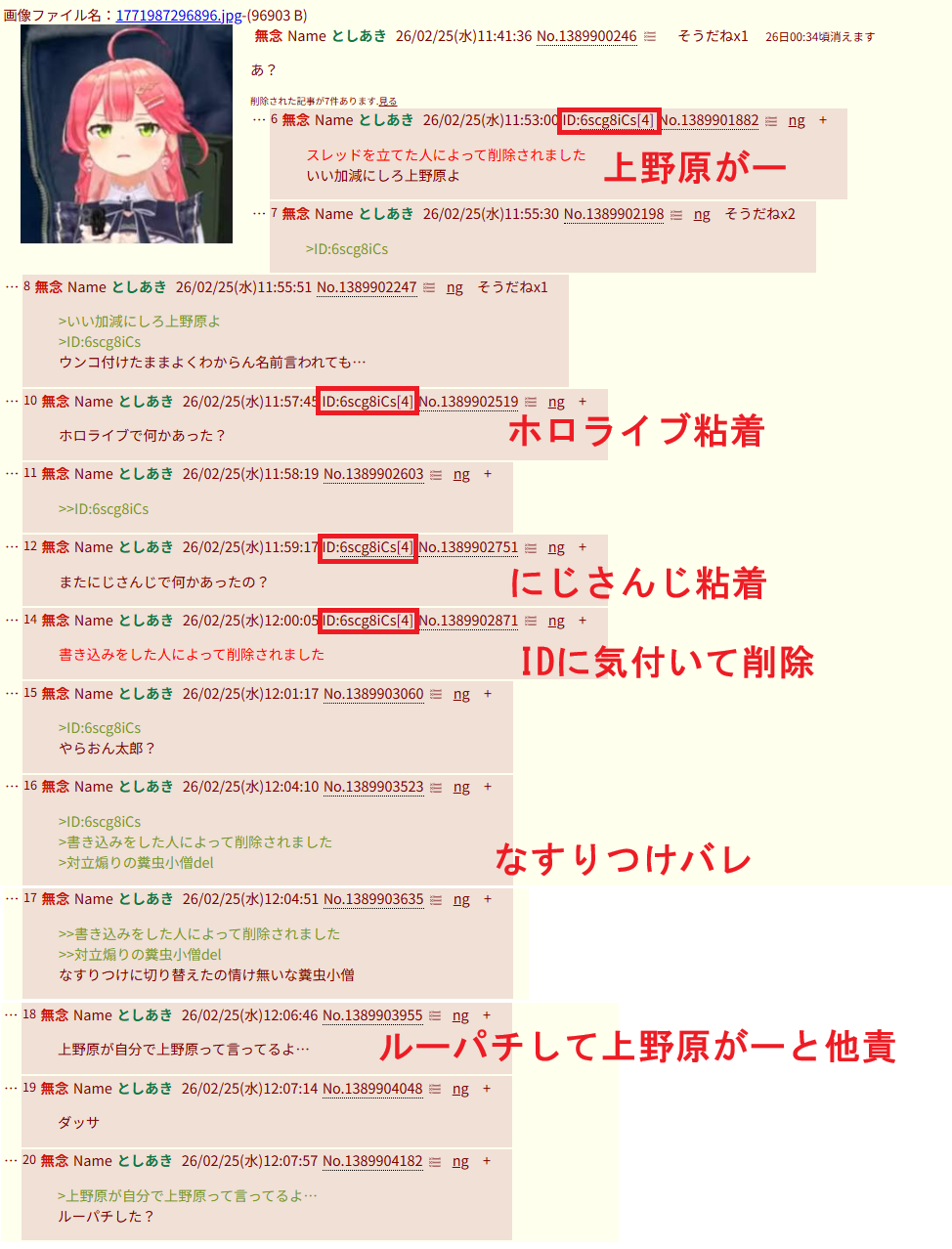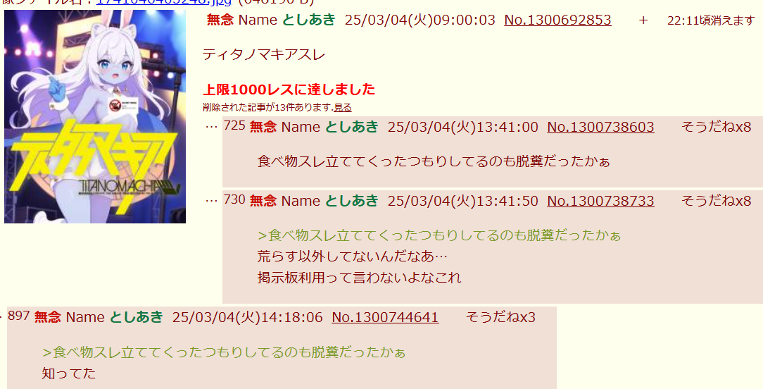 | … | 311無念Nameとしあき26/03/05(木)00:37:15No.1391661849+さっそく暇空関連の糖質が喚いててダメだった |