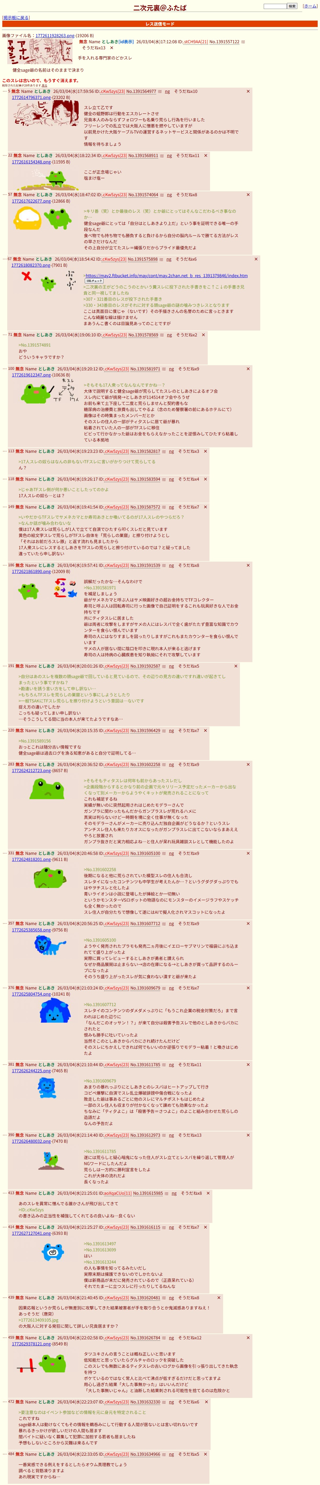 | … | 301無念Nameとしあき26/03/05(木)00:22:08No.1391659425そうだねx2>こういう糖質が二次裏に張り付いてるのってここ以外で騒ぐと排除される |