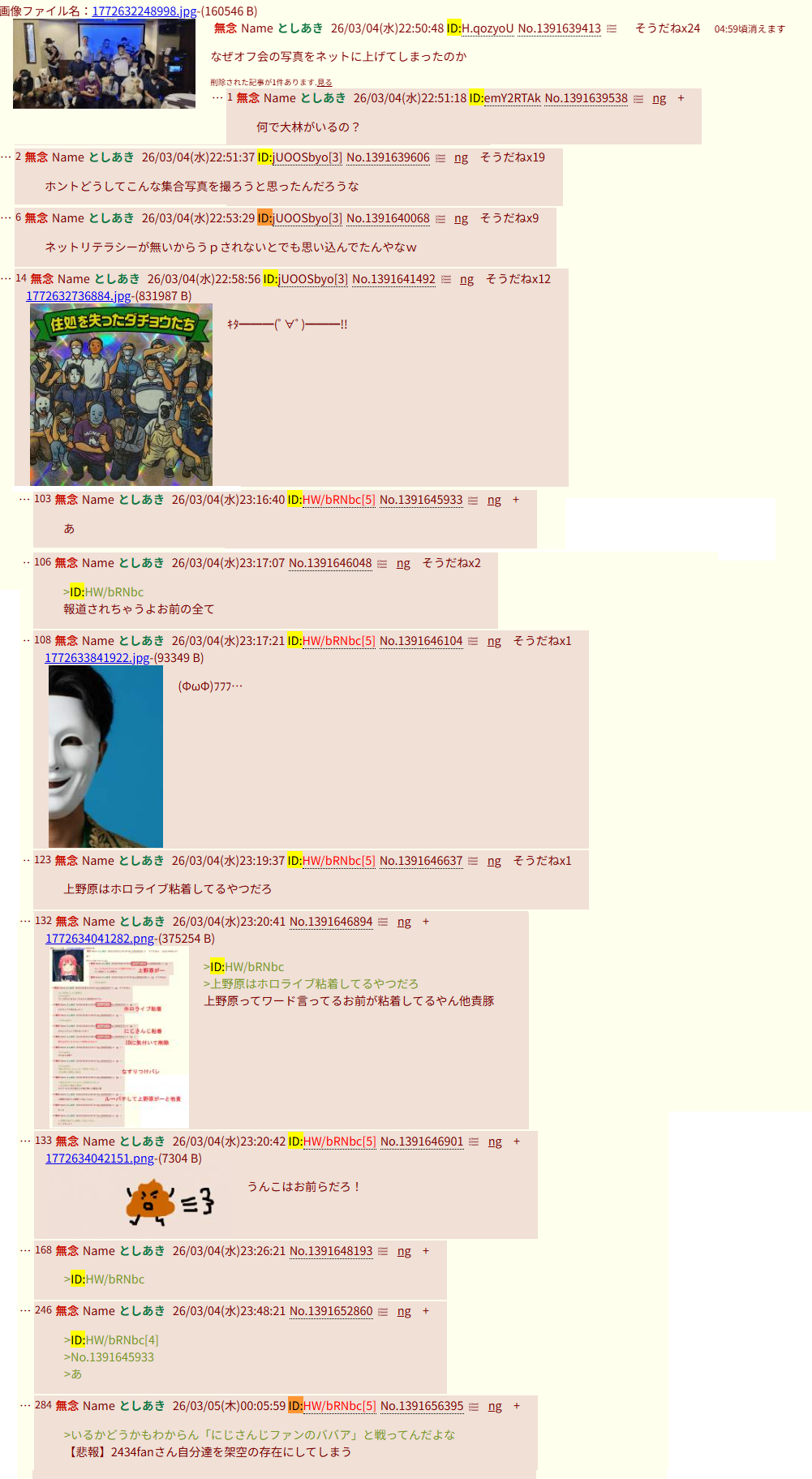 | … | 52無念Nameとしあき26/03/04(水)23:09:45No.1391644222そうだねx1>こいつらは糖質仲間にリアルで会えて結果暴走したんだろうなってまだわかるんよ顔は隠してるし |