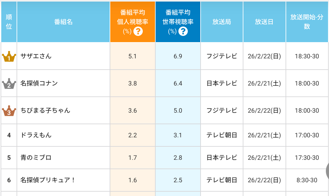 | … | 19無念Nameとしあき26/03/05(木)10:06:22No.1391700521そうだねx1>>ドラえもん思ったより低いと思ったがそもそもテレビ離れなのかな |