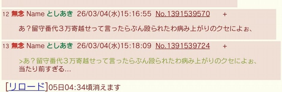 | … | 4無念Nameとしあき26/03/05(木)13:57:50No.1391738732そうだねx1精神雑談スレの懸垂豚の家特定されねぇかな |
