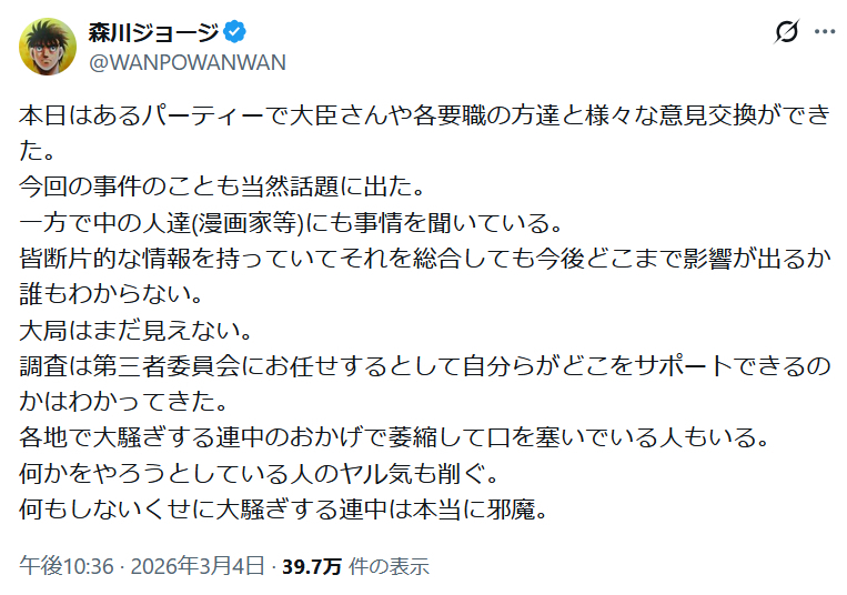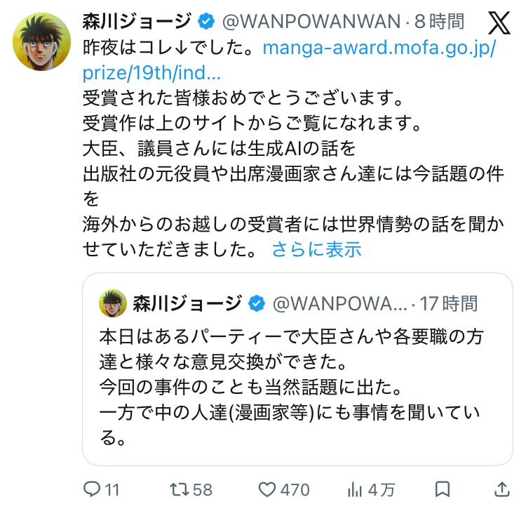 | … | 88無念Nameとしあき26/03/05(木)14:50:26No.1391746334そうだねx10>漫画家協会としてパーティに出て意見交換したり漫画家に事情を聞いているので |
