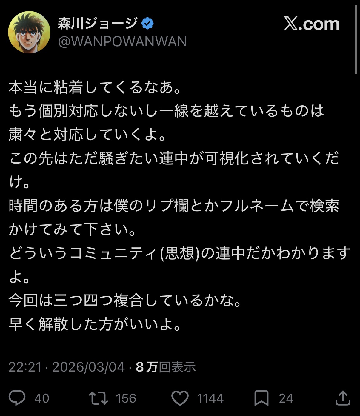 | … | 830無念Nameとしあき26/03/05(木)19:06:36No.1391791112+>そもそもボクシングマンガ描いてるからってジム経営するってボクジング自体かなり舐めてない? |